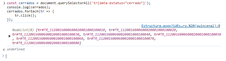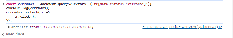 Un bonito código que primero busca los elementos tr, que son las filas de la tabal de menú que representan las pestañas que tengan el atributo data-estatus con el valor “cerrado”, los guardara en una lista, los imprime para que podamos verlos y posteriormente, uno a uno, activa el evento click sobre ellos, con lo que expanden sus pestañas subsecuentes.
