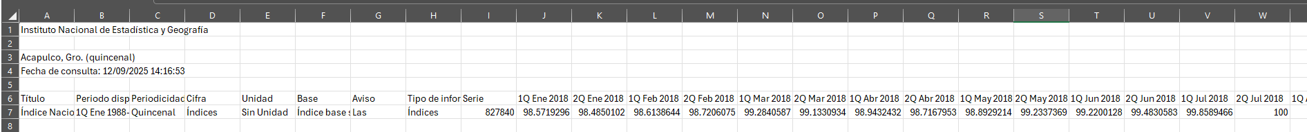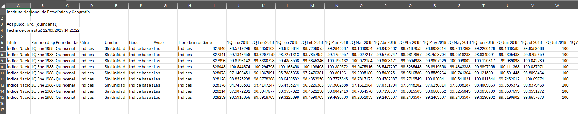 Cabe recalcar que lo primero que hace la función es quitar todas las entradas que contengan “por origen de los bienes (SCIAN 2018)”, pues son entradas que viene si la página contaba con una pestaña “Índice de precios al consumidor, por origen de los bienes (SCIAN 2018)” que a nosotros no nos interesan por el momento. Además de quitar aquellas columnas de quincenas o meses anteriores a 2018, pues como digo no todas las ciudades cuentan con ellas.