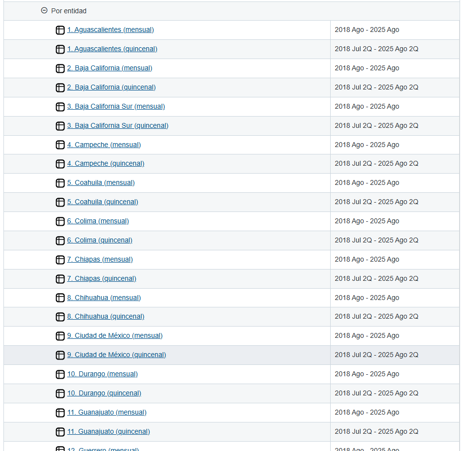 Cada estado o ciudad viene duplicada, una para mensual y otra para quincenal, que se refiere a la temporalidad con la que vienen reportados los indices.