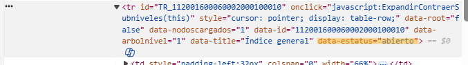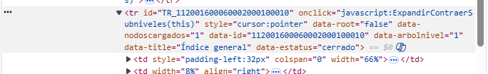 Donde podemos ver dos cosas importantes que resalta a nuestra vista, “onclick” y “data-estatus”, donde la primera indica lo que hará la página cuando se haga click en este elemnto (TODA la fila de la tabla), que en este caso ejecuta “ExpandirContraerSubniveles” a este elemento, que como vimos anteriormente despliega o contrae las pestañas subsecuentes. La segunda en mi caso tiene el valor “cerrado” pues no he hecho click para desplegar más pestañas.