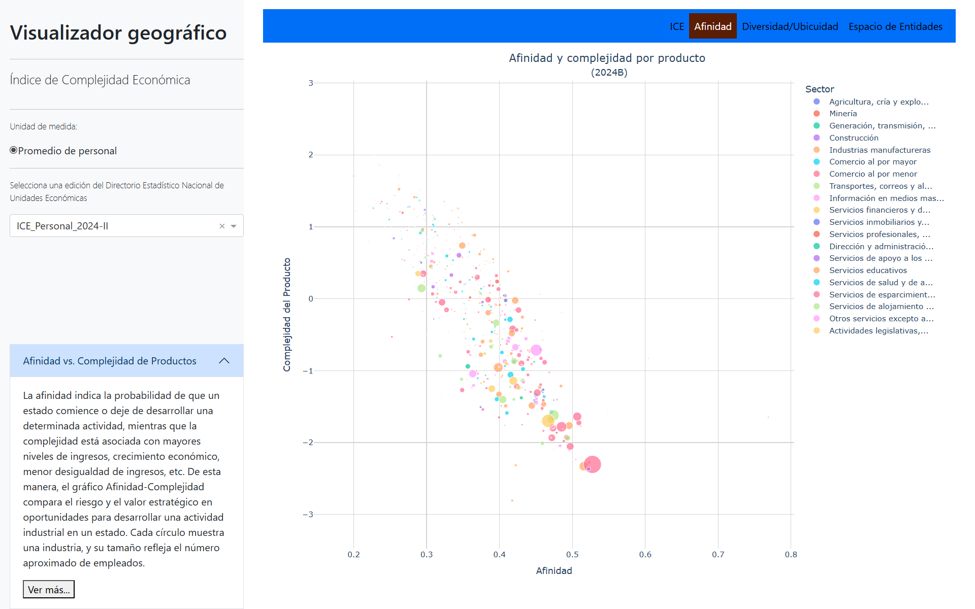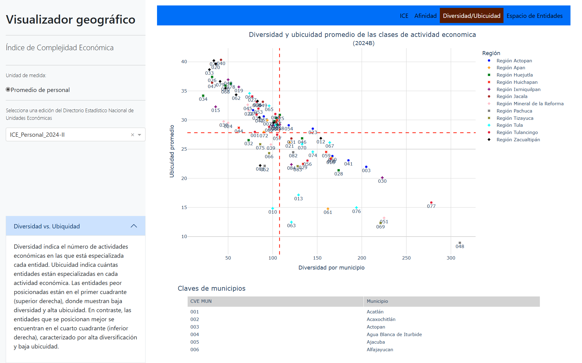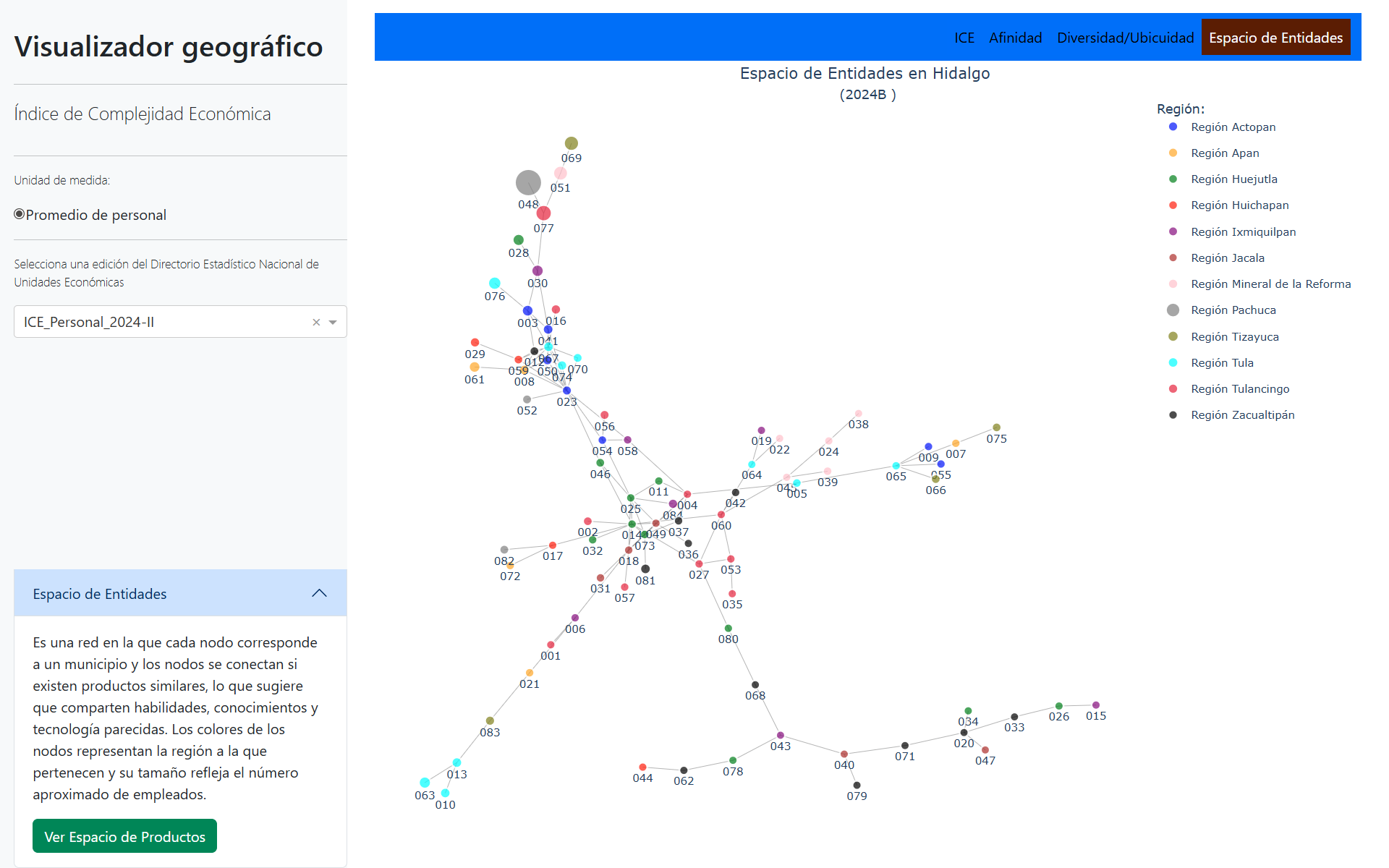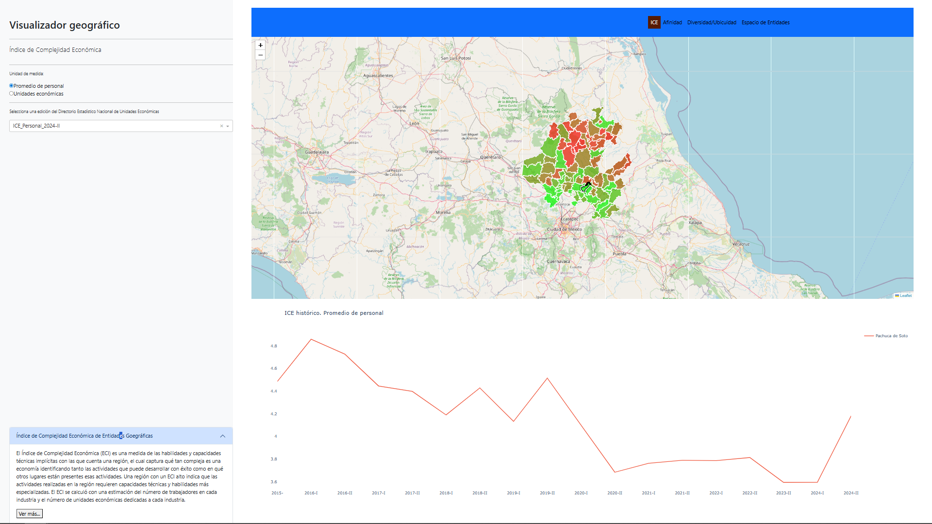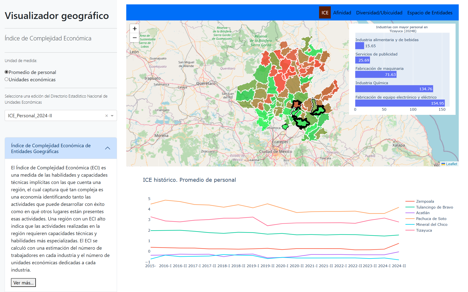 El Índice de Complejidad Económica (ECI) es una medida de las habilidades y capacidades técnicas implícitas con las que cuenta una región, el cual captura qué tan compleja es una economía identificando tanto las actividades que puede desarrollar con éxito como en qué otros lugares están presentes esas actividades. Una región con un ECI alto indica que las actividades realizadas en la región requieren capacidades técnicas y habilidades más especializadas. El ECI se calculó con una estimación del número de trabajadores en cada industria y el número de unidades económicas dedicadas a cada industria.