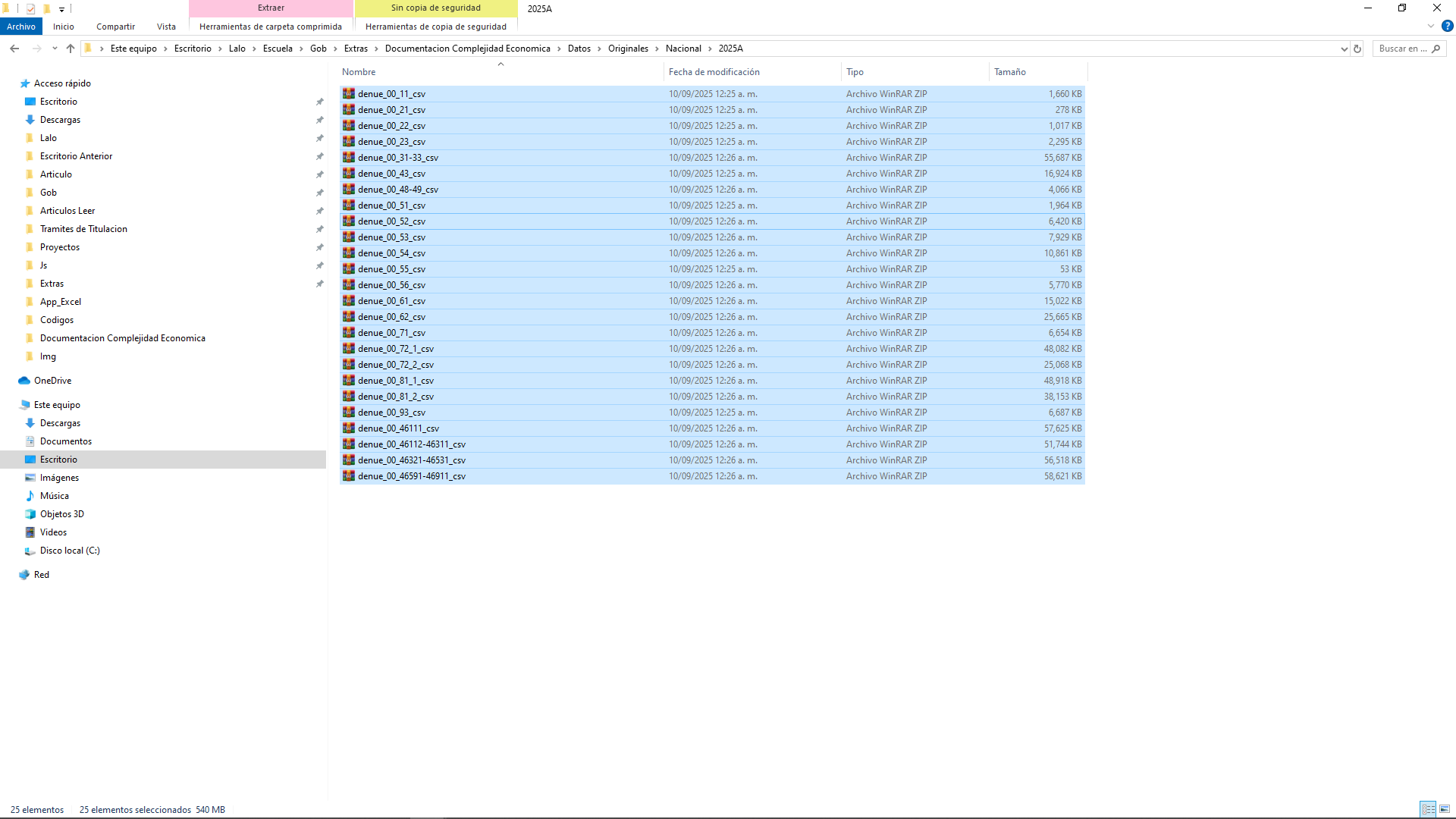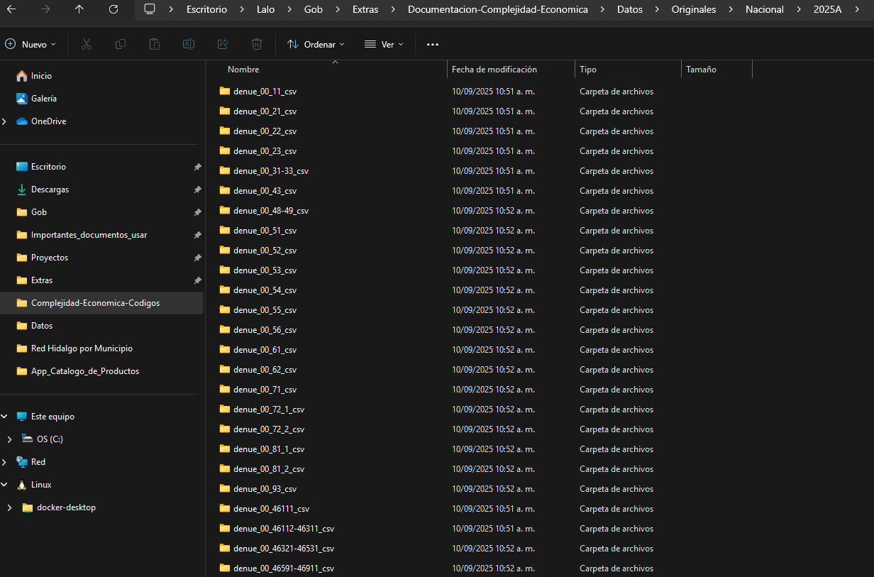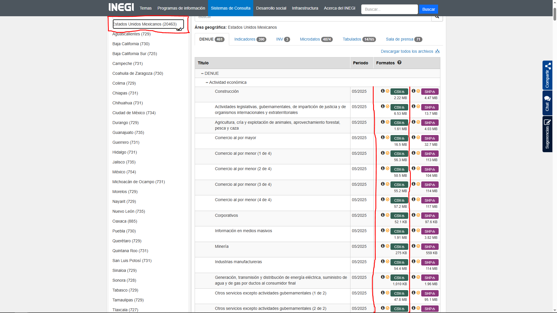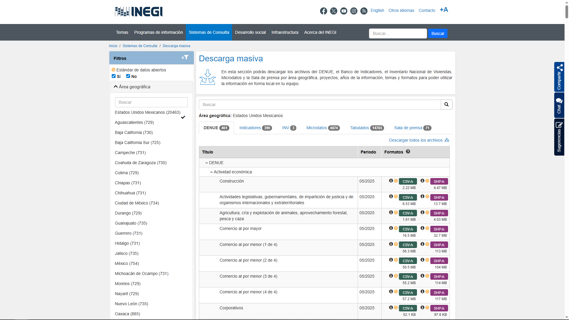 Por otro lado, cuando es a nivel nacional dentro de la página del DENUE utilizaremos los filtros para seleccionar Estados Unidos Mexicanos y descargar los 25 archivos CSV.