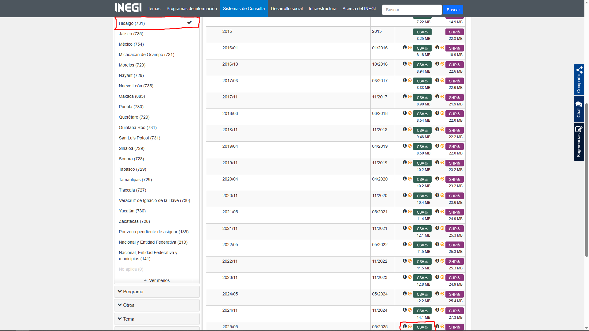 Para el caso de Hidalgo, dentro de la página del DENUE utilizaremos los filtros para seleccionar la entidad y descargar el archivo en formato CSV. En este ejercicio trabajaremos con la base correspondiente a mayo 2025.